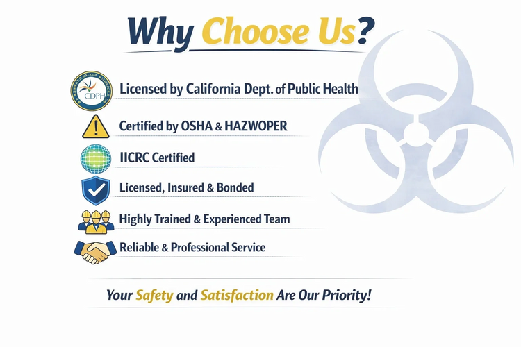 Our team is licensed, trained, and certified to meet strict OSHA, EPA, and industry standards. Every job is approached with precision, respect, and confidentiality. We use professional-grade equipment, approved disinfectants, and proven protocols to ensure affected areas are properly cleaned, sanitized, and safe for reentry.